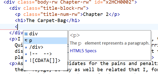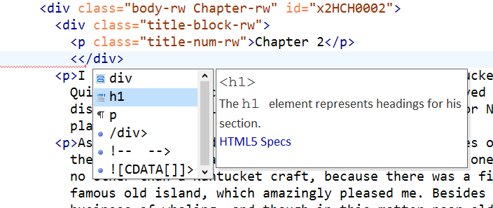 The same mechanism can be used for associating two or more Relax NG schemas. Our sample document (Moby Dick, kindly provided by Dave Cramer without schema associations) features two Relax NG schema associations: